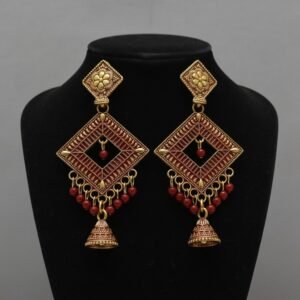 Jhumka Diamond-Shaped Red Beaded Earrings