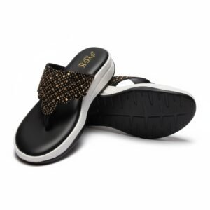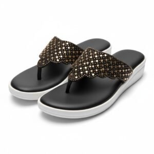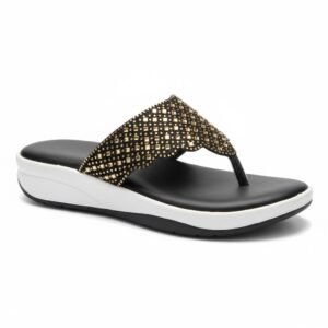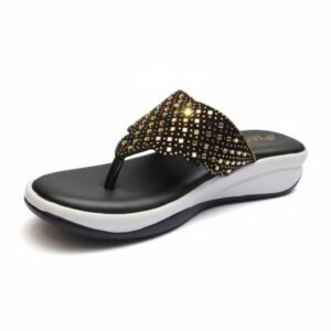 That’s a beautiful pair of sandals! the style appears to be black and gold embellished wedge sandals Foam-Padded Lining TPR.