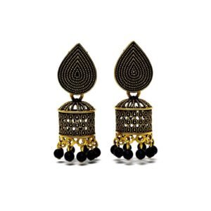 Combo set of two stylish traditional earrings featuring antique gold jhumka danglers, with black bead drops and oxidized silver geometric Chand Bali-style earrings with gunroom accents—perfect for festive, ethnic, and party wear.