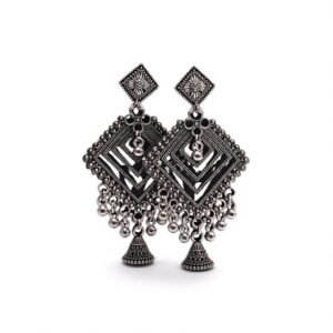 black bead drops and oxidized silver geometric chandbali